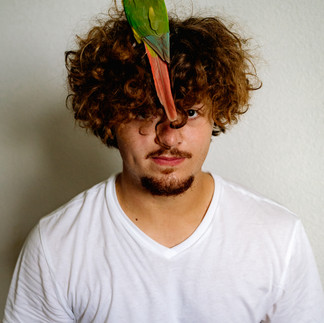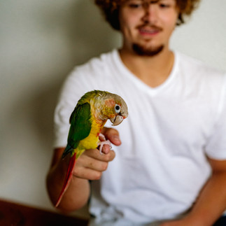After spending 45 minutes downtown we headed to the family home to do photos with his pet, Rona, a pineapple green cheeked conure. Quillan informed me that Rona is not flight trained so we will need to do the photos indoors. I was a bit worried about the light in the room we were photographing in and the distance from the light source. Luckily, I was still using my 35 mm lens at this time, so I could maintain a closer proximity to Quillan and Rona.
